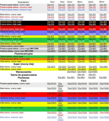 - Taśma biała, żółta, czerwona, niebieska,zielona z czarnym nadrukiem oraz czarna z białym nadrukiem, szerokość 12mm, długość 8m.